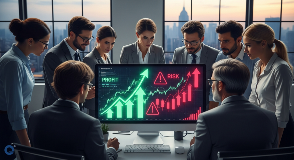 Một nhóm người đang cùng nhau xem xét các biểu đồ tài chính, với một bên là các mũi tên đi lên thể hiện lợi nhuận, và bên kia là các biểu tượng cảnh báo rủi ro.