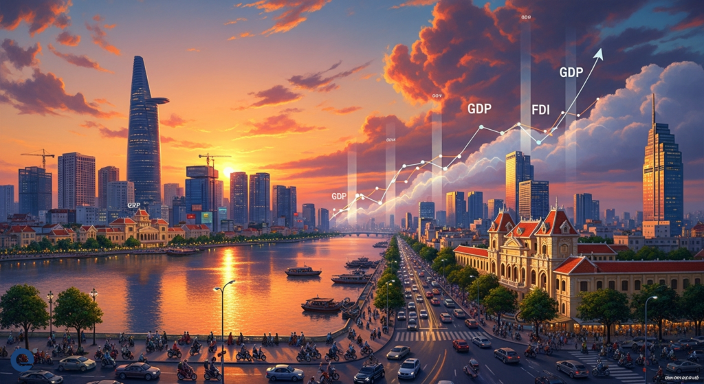 Bức tranh toàn cảnh về sự tăng trưởng kinh tế Việt Nam, với các chỉ số GDP và đầu tư FDI liên tục tăng trưởng mạnh mẽ.