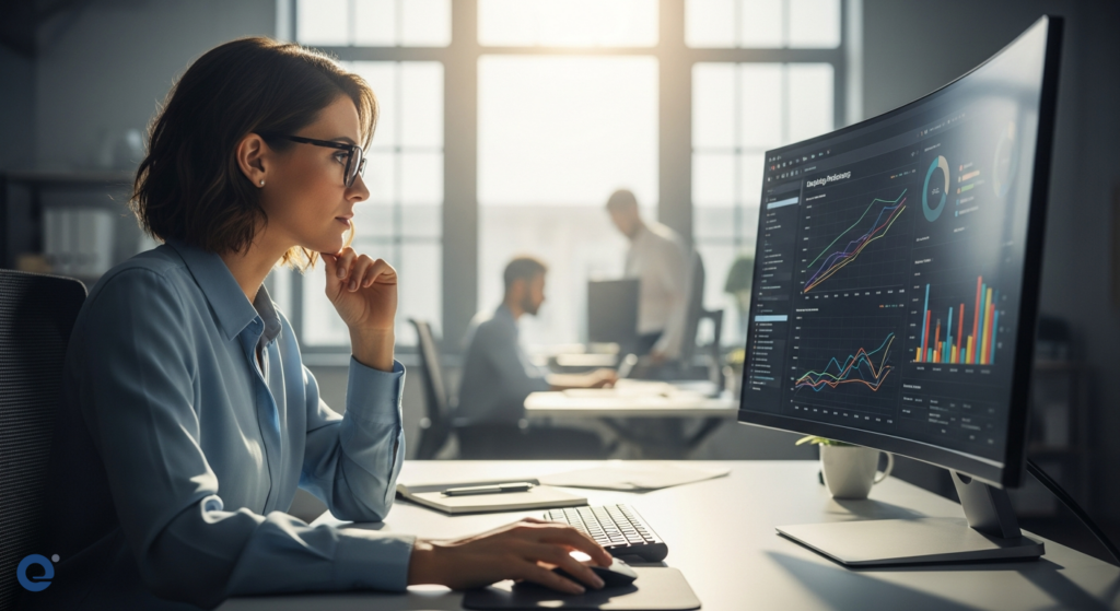 Một nhà quản lý marketing đang xem xét biểu đồ hiệu suất chiến dịch trên màn hình máy tính.