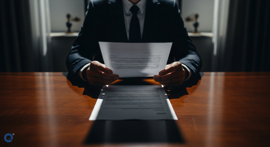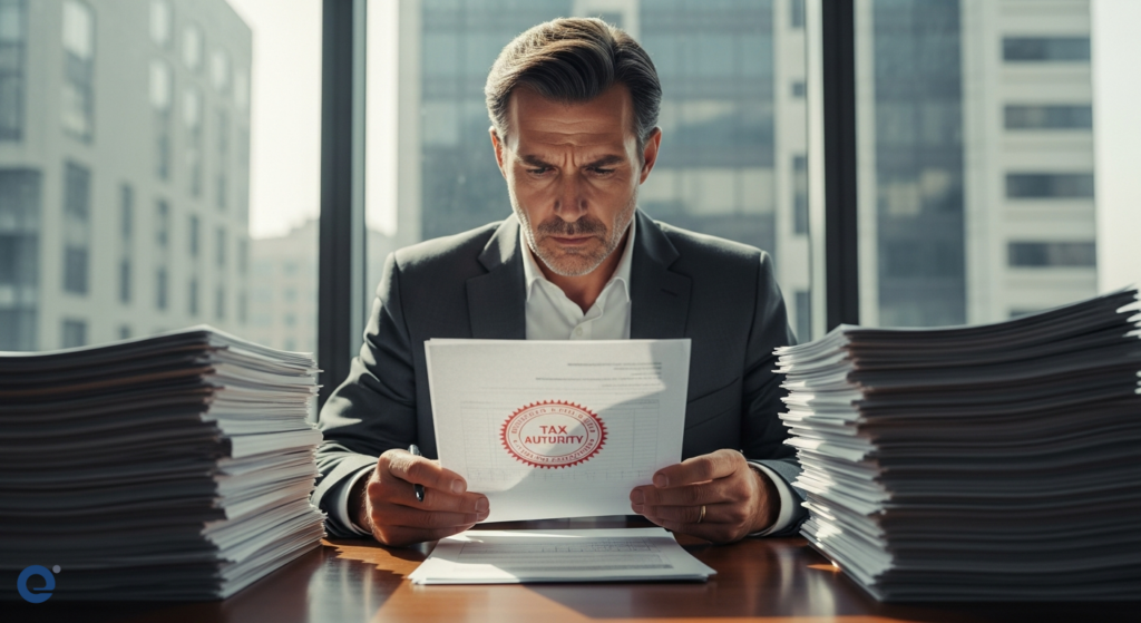 Một người đàn ông trung niên trong bộ vest lịch lãm đang cẩn thận sắp xếp các tập tài liệu dày cộp trên bàn làm việc, ánh mắt đăm chiêu nhìn vào tờ giấy có dấu đỏ của cơ quan thuế.