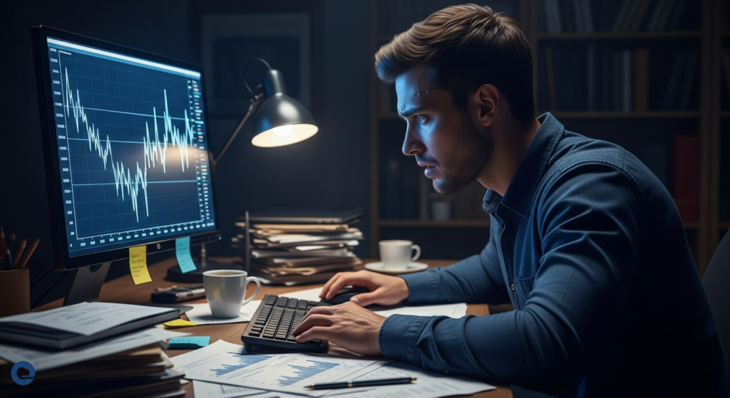 Một nhà đầu tư nhỏ đang nhìn chằm chằm vào màn hình máy tính với vẻ mặt lo lắng khi các chỉ số thị trường giảm sâu.