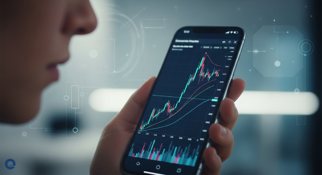 Một người đang xem xét các tùy chọn ứng dụng trên điện thoại, với biểu đồ tài chính hiển thị rõ ràng.