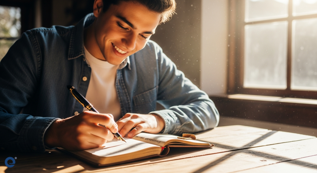 Một người trẻ đang ghi chép cẩn thận vào sổ tay, mỉm cười khi nhìn lại các khoản chi tiêu đã được ghi lại.