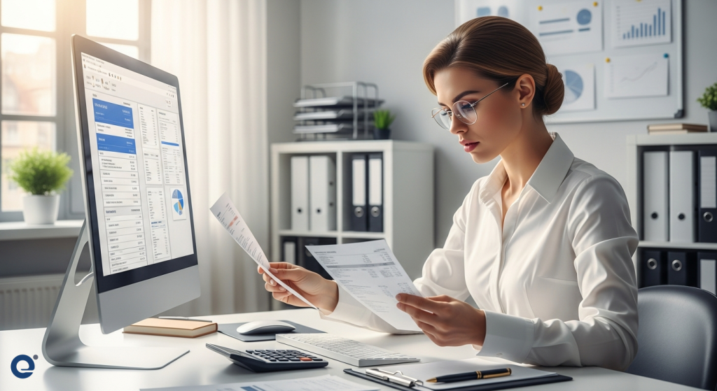 Nhân viên kế toán đang cẩn thận kiểm tra các chứng từ hóa đơn điện tử trên màn hình máy tính.