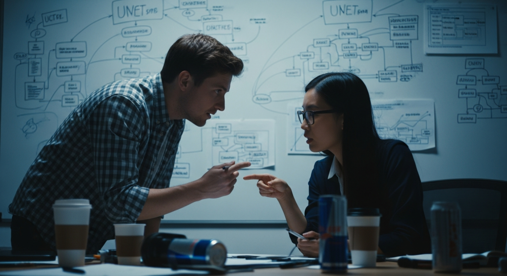 Hai kỹ sư phần mềm đang thảo luận sôi nổi trước một bảng trắng đầy các sơ đồ logic và kiến trúc hệ thống.