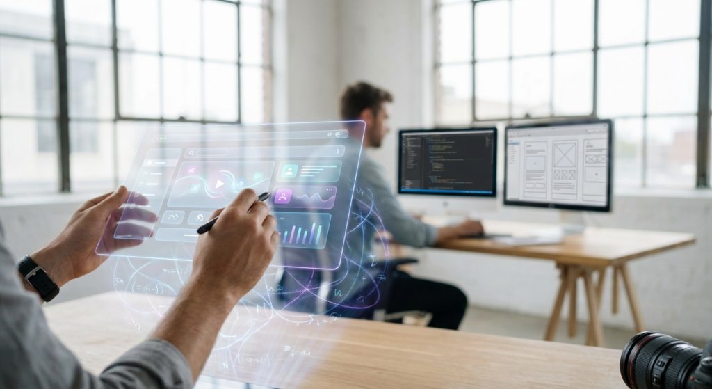 Một nhà thiết kế đang tinh chỉnh prompt trên màn hình, bên cạnh là giao diện AI vừa tạo ra.