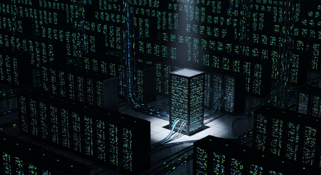 Một dàn máy chủ đang âm thầm xử lý dữ liệu vào ban đêm, giống như những anh hùng không bao giờ ngủ trong các trò chơi nhàn rỗi.