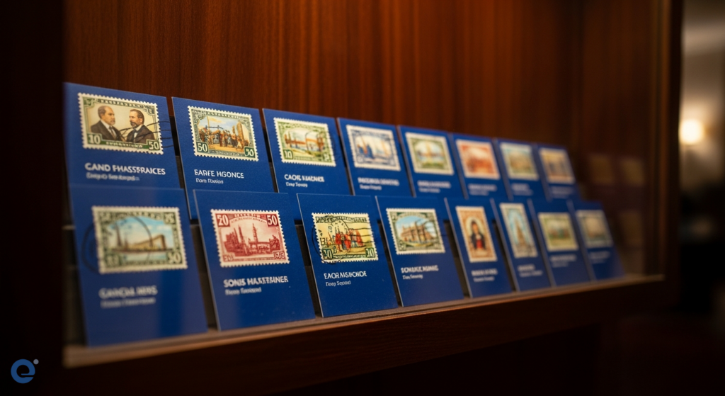 Một góc trưng bày tem quý hiếm, nơi mỗi con tem là một câu chuyện lịch sử được lưu giữ.