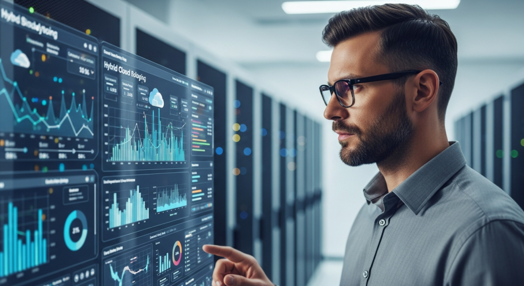 Một kỹ sư đang giám sát bảng điều khiển đám mây lai, cân bằng tải giữa máy chủ tại chỗ và tài nguyên đám mây công cộng.