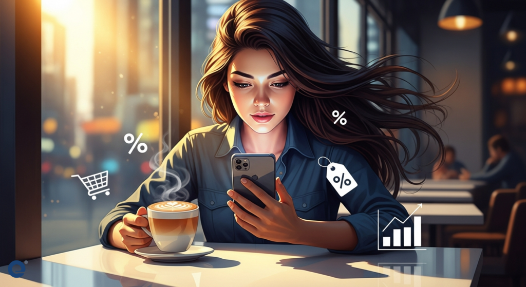 Một người phụ nữ đang chăm chú lướt điện thoại, tay cầm một ly cà phê, xung quanh là các biểu tượng giảm giá và mua sắm.