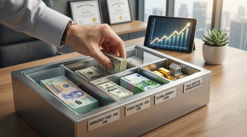 Đây là phương pháp phân bổ tiền mặt sang nhiều loại ngoại tệ mạnh khác nhau. Ví dụ, thay vì chỉ giữ VND, bạn có thể nắm giữ một phần dưới dạng Đô la Mỹ (USD), Euro (EUR), hoặc Yên Nhật (JPY). Mỗi đồng tiền có mối tương quan khác nhau với các yếu tố kinh tế toàn cầu.