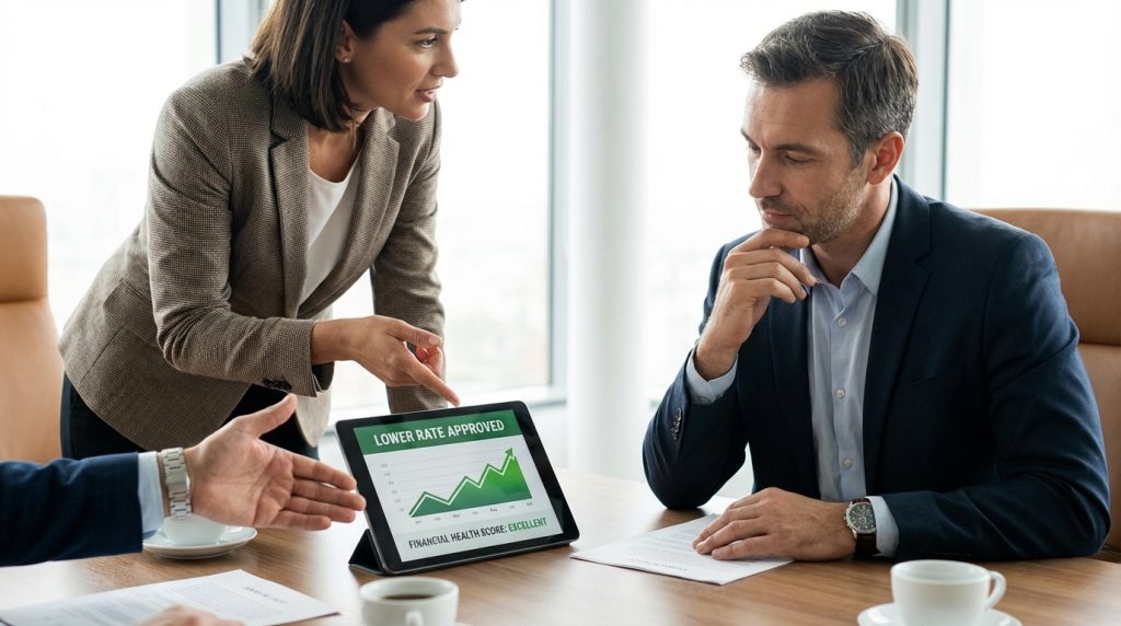 Một nhà đàm phán tự tin trình bày dữ liệu tài chính sạch cho nhân viên ngân hàng.