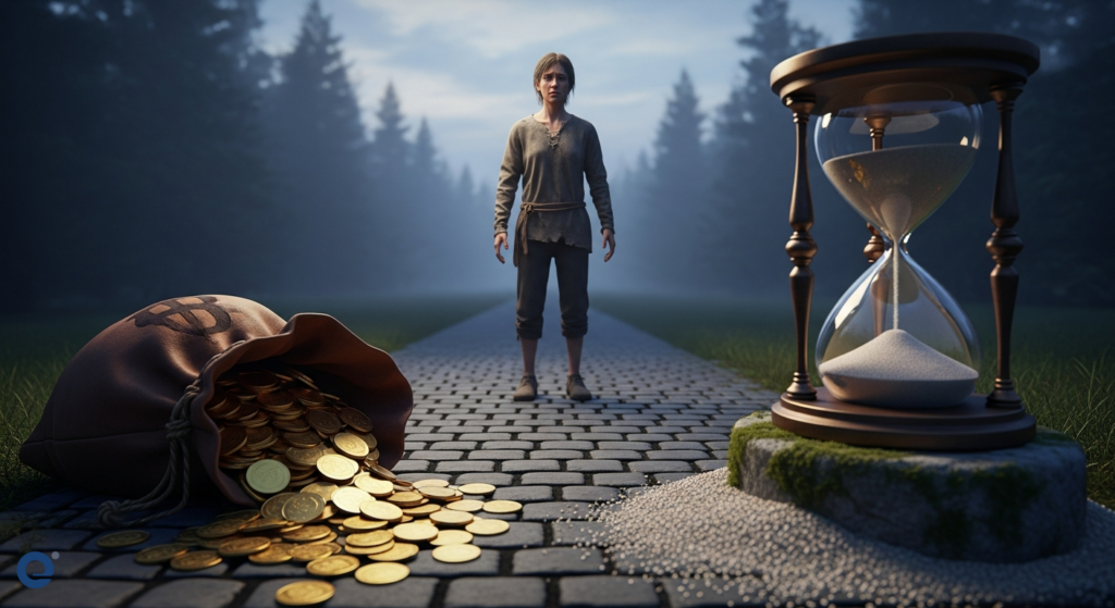Một người đang cân nhắc giữa hai con đường, một bên là túi tiền và bên kia là biểu tượng thời gian.