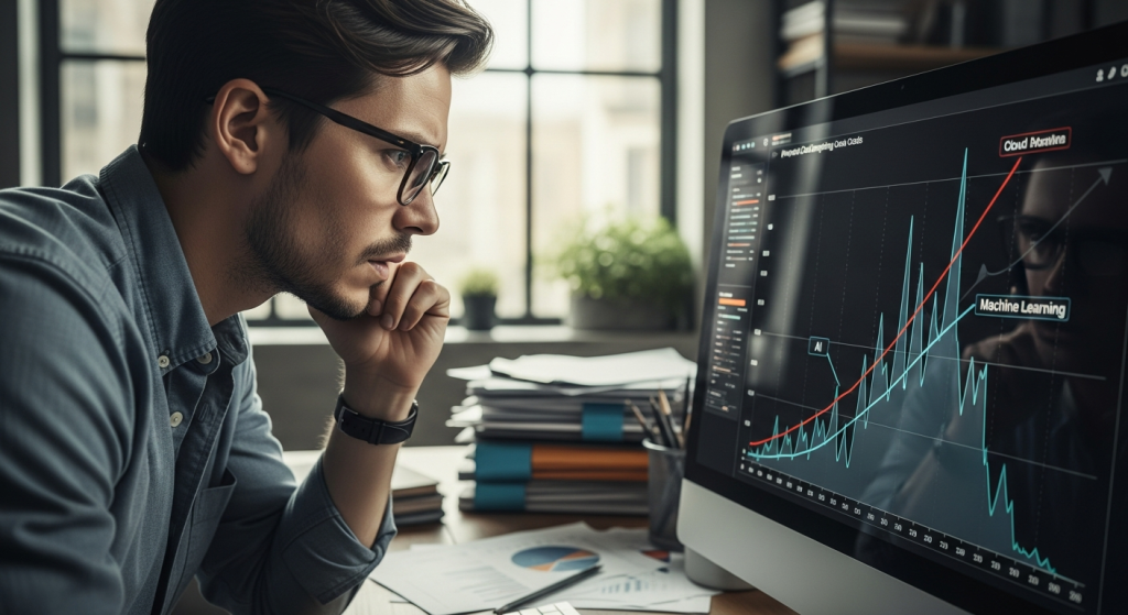 Một nhà phân tích ngân sách đang xem xét biểu đồ dự báo chi phí đám mây tăng vọt, với các đường biểu thị cho AI và machine learning.