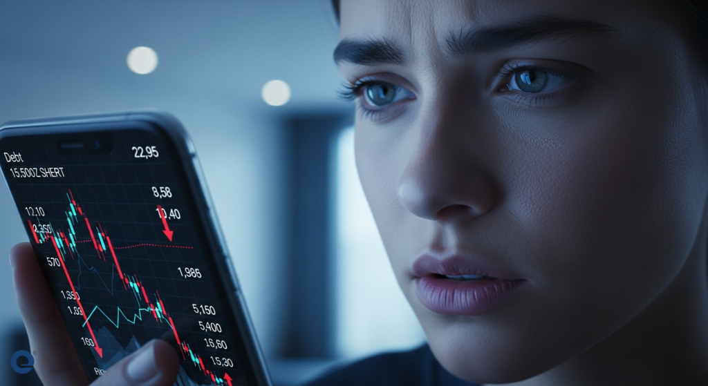 Một người trẻ đang chăm chú nhìn vào màn hình điện thoại, với biểu đồ tài chính và các con số nợ hiển thị rõ ràng.