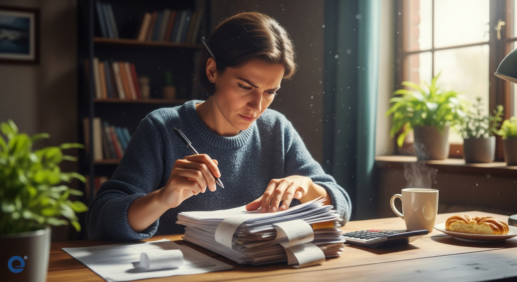 Một nhà sáng tạo nội dung đang cẩn thận sắp xếp các hóa đơn và chứng từ, chuẩn bị cho kỳ quyết toán thuế sắp tới.