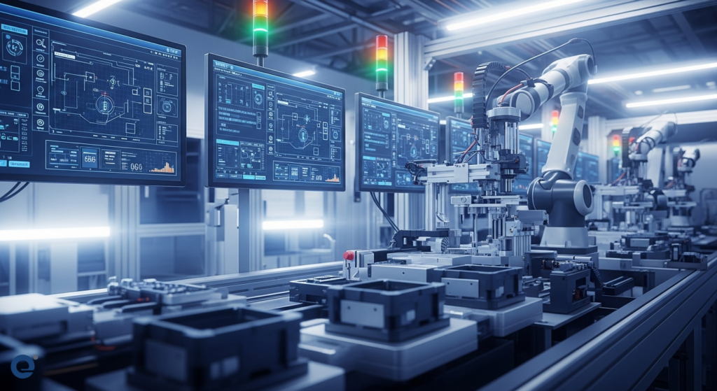 Một dây chuyền sản xuất hiện đại với các cảm biến và màn hình theo dõi, cho thấy sự chú trọng vào việc kiểm soát chất lượng từng bước.