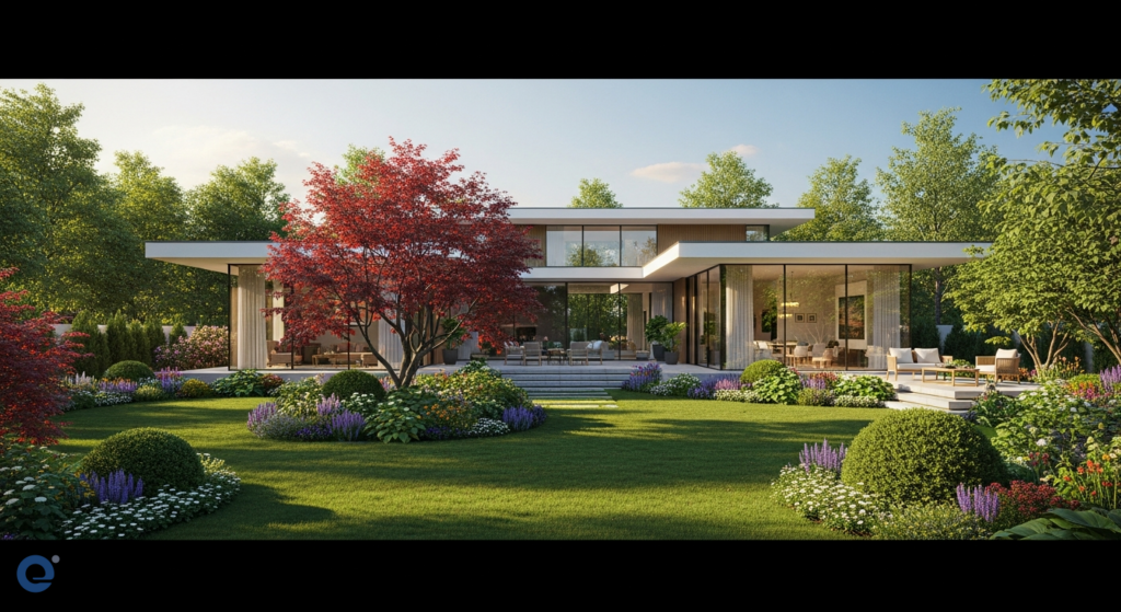 Một ngôi nhà hiện đại với khu vườn xanh mát, tượng trưng cho sự ổn định và tăng trưởng của bất động sản.