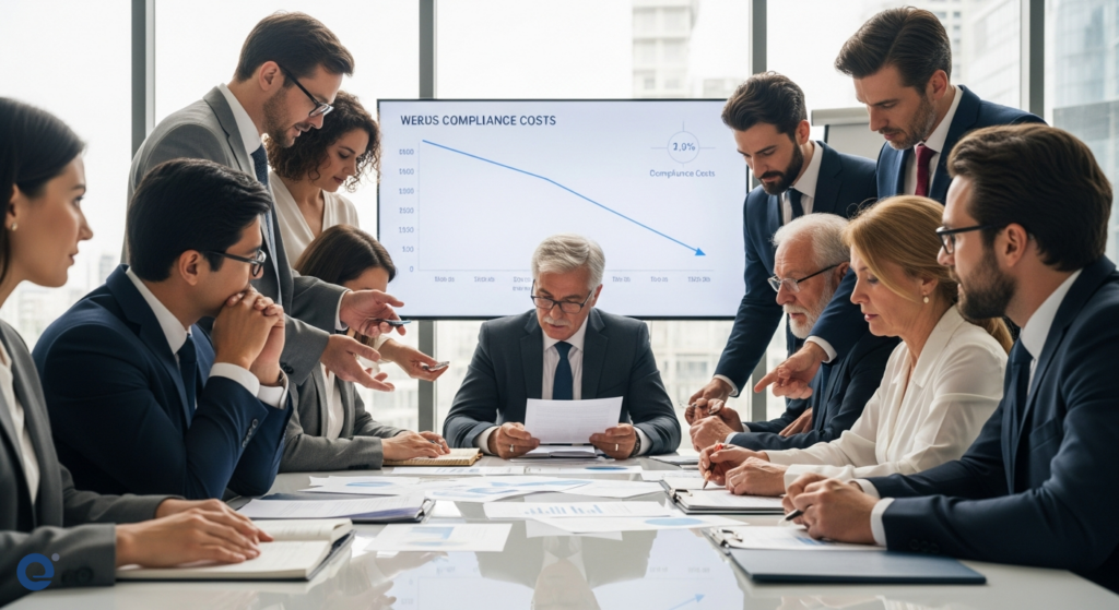 Một nhóm luật sư và chuyên gia đang thảo luận sôi nổi về các văn bản pháp luật, bên cạnh là màn hình hiển thị các biểu đồ chi phí tuân thủ đang giảm dần.