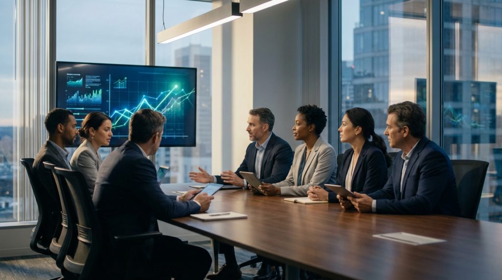 Một giám đốc nhân sự đang xem xét bảng lương toàn cầu trên một màn hình duy nhất, thể hiện sự kiểm soát và rõ ràng.