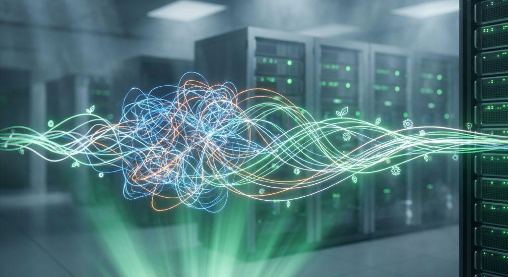 Một kỹ sư đang quan sát các khối dữ liệu kỹ thuật số (token) được sắp xếp hiệu quả, giảm lãng phí năng lượng.