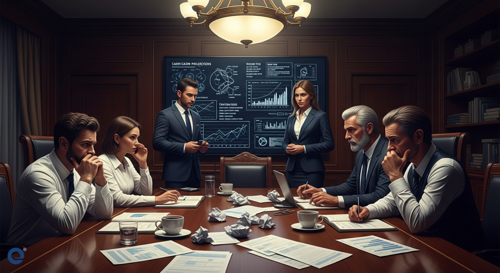 Một buổi họp căng thẳng giữa các cổ đông và chuyên gia phân tích tài chính, xung quanh là các biểu đồ phức tạp về dòng tiền và thuế.