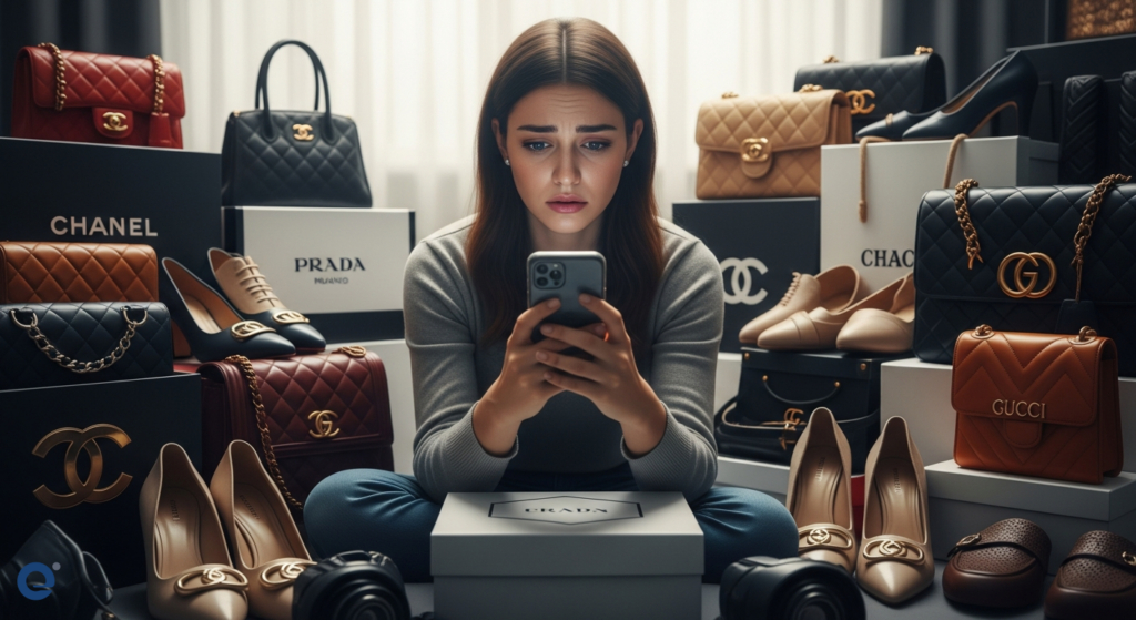 Một cô gái trẻ đang lướt điện thoại, xung quanh là những món đồ hiệu chưa dùng đến, thể hiện sự mâu thuẫn giữa mong muốn và thực tế tài chính.
