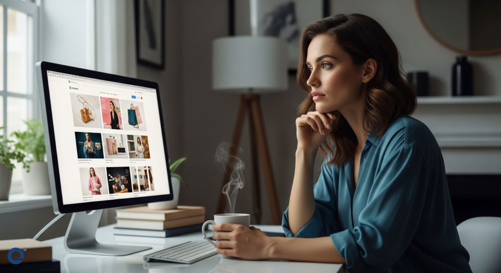 Một người phụ nữ đang ngồi trước máy tính, lướt qua các trang web mua sắm trực tuyến với vẻ mặt suy tư, tay cầm một tách cà phê.
