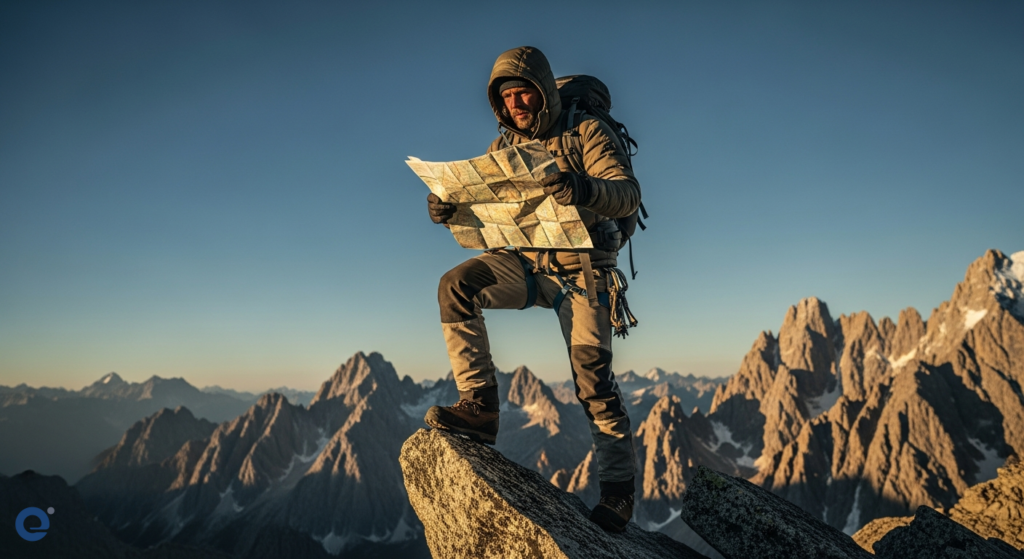 Một nhà leo núi đang kiểm tra bản đồ, trang phục của họ trông bền bỉ và sẵn sàng cho thử thách phía trước.