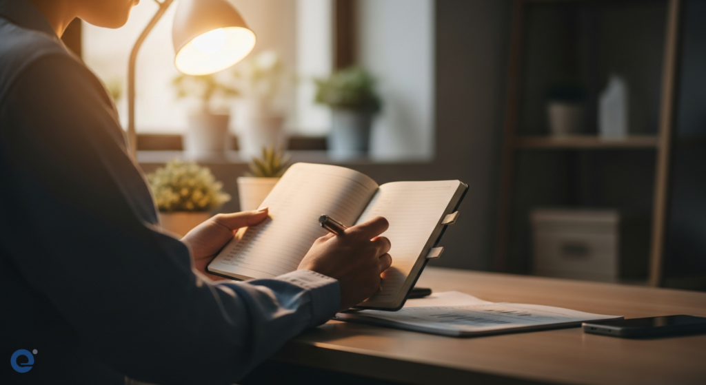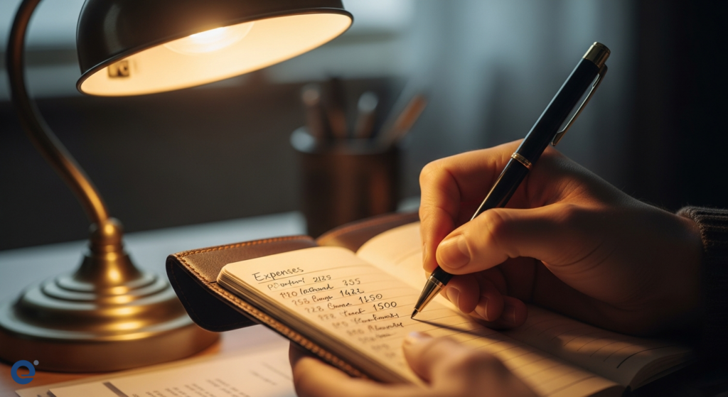 Một người đang cẩn thận ghi chép các khoản chi tiêu vào một cuốn sổ nhỏ, ánh sáng dịu nhẹ chiếu lên trang giấy, tạo cảm giác tập trung và bình yên.