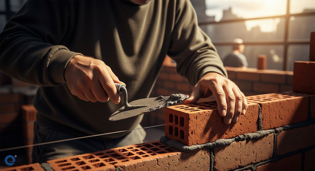 Một người đang cẩn thận đặt những viên gạch lên một bức tường vững chắc, tượng trưng cho việc xây dựng tài sản từng bước.