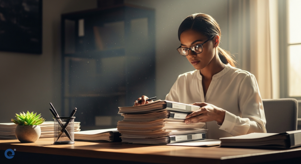 Một người phụ nữ đang cẩn thận sắp xếp các tập hồ sơ thuế trên bàn làm việc, ánh sáng dịu nhẹ chiếu vào, tạo cảm giác ngăn nắp và chuyên nghiệp.