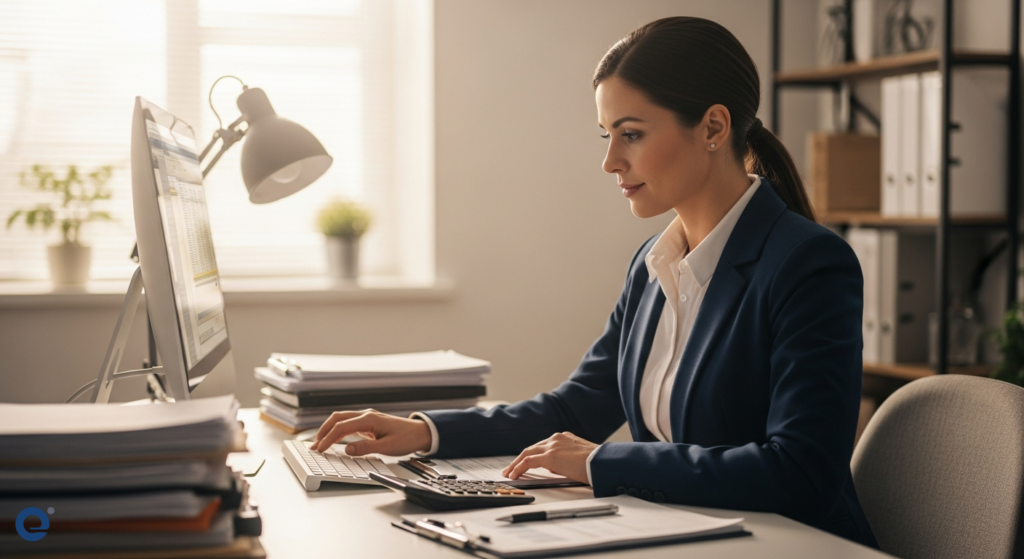Một kế toán viên đang cẩn thận nhập liệu vào phần mềm kế toán trên máy tính, ánh sáng dịu nhẹ chiếu vào bàn làm việc, thể hiện sự tỉ mỉ và chính xác trong công việc tài chính.