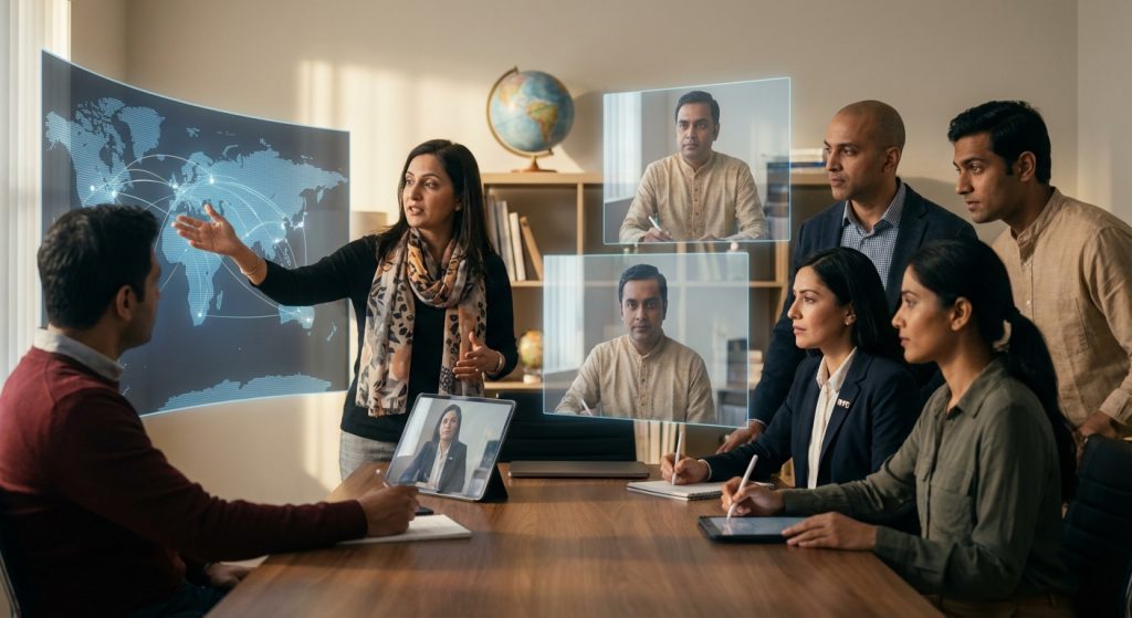 Một đội ngũ đa quốc gia đang thảo luận sôi nổi qua màn hình, xóa nhòa khoảng cách địa lý và thúc đẩy dự án tiến lên.