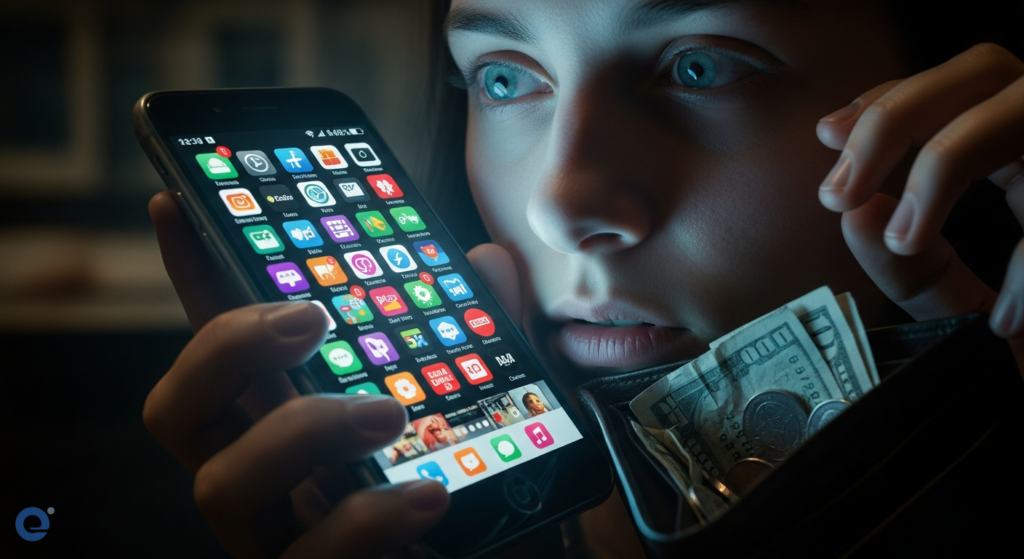 Một người đang nhìn chằm chằm vào màn hình điện thoại, với hàng loạt ứng dụng mua sắm và quảng cáo hiện lên, trong khi ví tiền của họ đang dần trống rỗng.